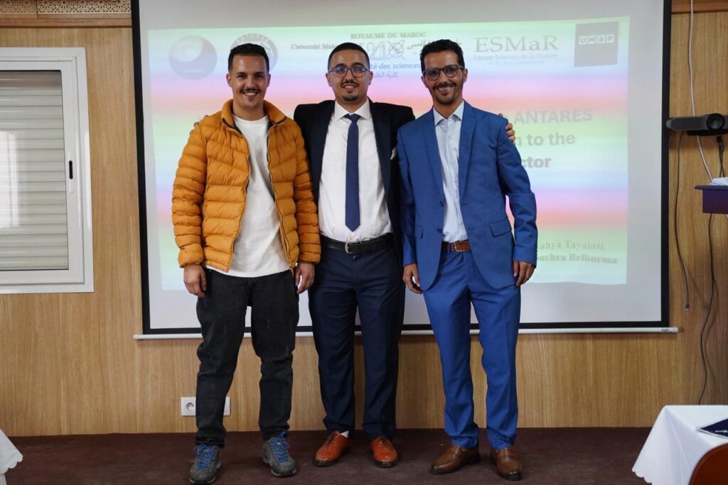 وهي دراسة علمية تتعلق بالبحث في الجسيمات النادرة من خلال تلسكوب ANTARES لرصد النيوترينو، إلى جانب الإسهام في مشروع بناء كاشف KM3NeT، الذي يعد من المشاريع العلمية الدولية الرائدة في مجال فيزياء الجسيمات الفلكية. وبعد مناقشة مستفيضة من طرف لجنة التحكيم، نال الباحث ميزة مشرف جداً مع تنويه اللجنة، تقديراً لجودة عمله العلمي وأهمية النتائج التي توصل إليها. ويُعد هذا التتويج إنجازاً أكاديمياً مشرفاً يضاف لمسار الباحث، ويعكس قيمة البحث العلمي كرافعة للتقدم والتطور.