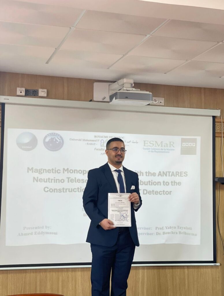 وحملت الأطروحة عنوان: “Magnetic Monopoles Search with the ANTARES Neutrino Telescope and Contribution to the Construction of the KM3NeT Detector”
