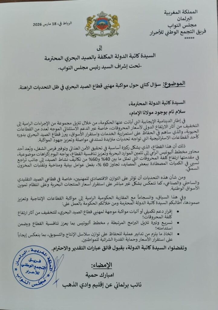 وجه النائب البرلماني مبارك حمية، عن فريق التجمع الوطني للأحرار بمجلس النواب، سؤالا كتابيا إلى كاتبة الدولة المكلفة بالصيد البحري زكية دريوش، مسلطا الضوء على الوضعية الصعبة التي يعيشها قطاع الصيد البحري في ظل التحديات الاقتصادية والبيئية المتزايدة.